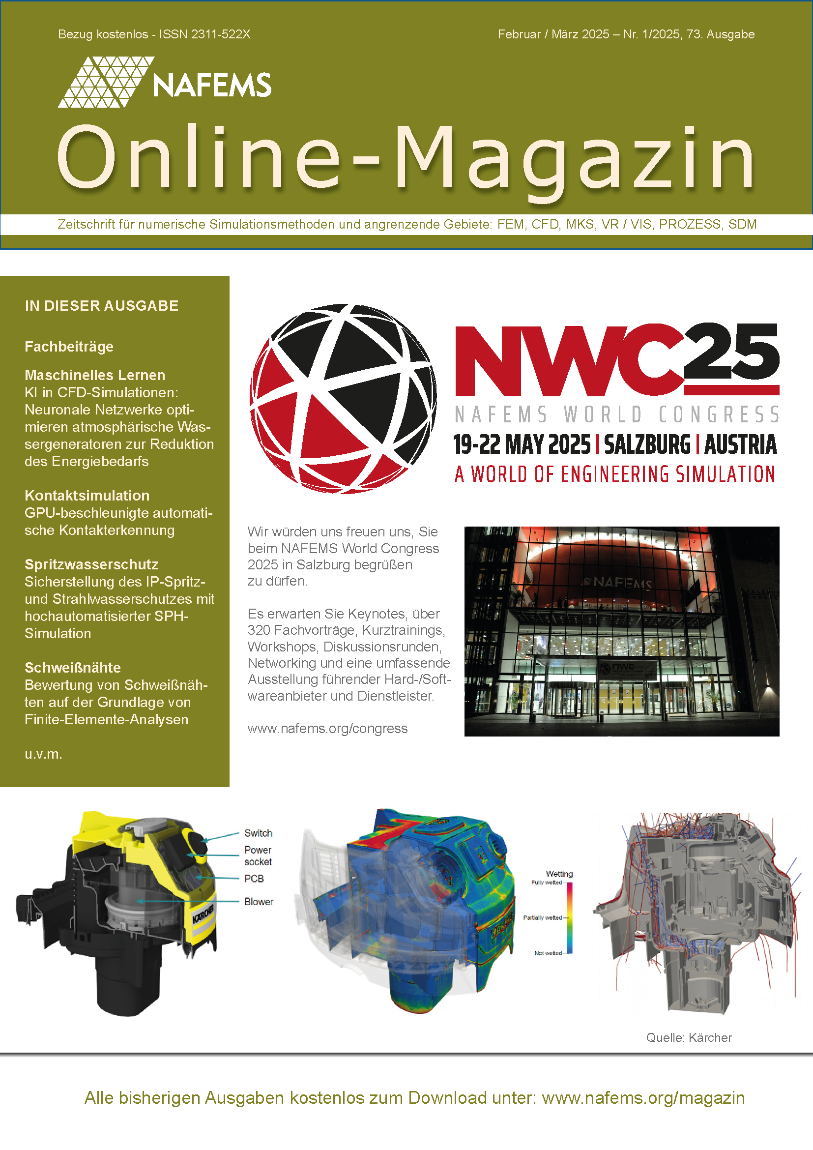 The German-language magazine is published four times a year and is aimed at users of numerical simulation methods and related areas: FEM, CFD, MKS, VR, process simulation, SDM. Technical articles in this issue are: