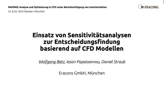 The presentation is on the use of sensitivity analyses for decision-making based on Computational Fluid Dynamics (CFD) models. The presenters demonstrate this through a simple example of designing a protective wall, highlighting the importance of uncertainty propagation in decision-making. The presentation emphasizes that all analyses are performed post-processing based on a single Monte Carlo simulation, showcasing the critical role of choosing the right sensitivity measure, in this case, the Expected Value of Partial Perfect Information (EVPPI), to obtain the desired answers. The selection of the sensitivity measure is guided by a clearly defined question regarding the purpose of the analysis, focusing on the 'Quantity of Interest' in the model's output and the specific aim of the analysis.